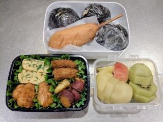 おにぎりの中身は明太、鮭、サバカリー(業スー)まぜご飯。